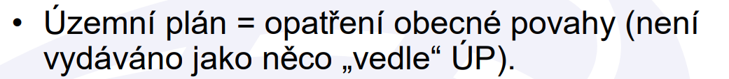 Uvedené je ale výrazem nepochopení toho, že samotný územní plán (jeho tzv. závazná část označovaná také někdy jako výrok) je oním opatřením obecné povahy, ke kterému patří jeho odůvodnění, a žádné další „opatření“ se už k územnímu plánu zkrátka nevydává. Nic podobného není třeba vkládat ani do textové části územního plánu, i když samozřejmě nejde o nějakou nezákonnost, jen to prostě nevypadá dobře. Připomíná se to i v prezentaci MMR: