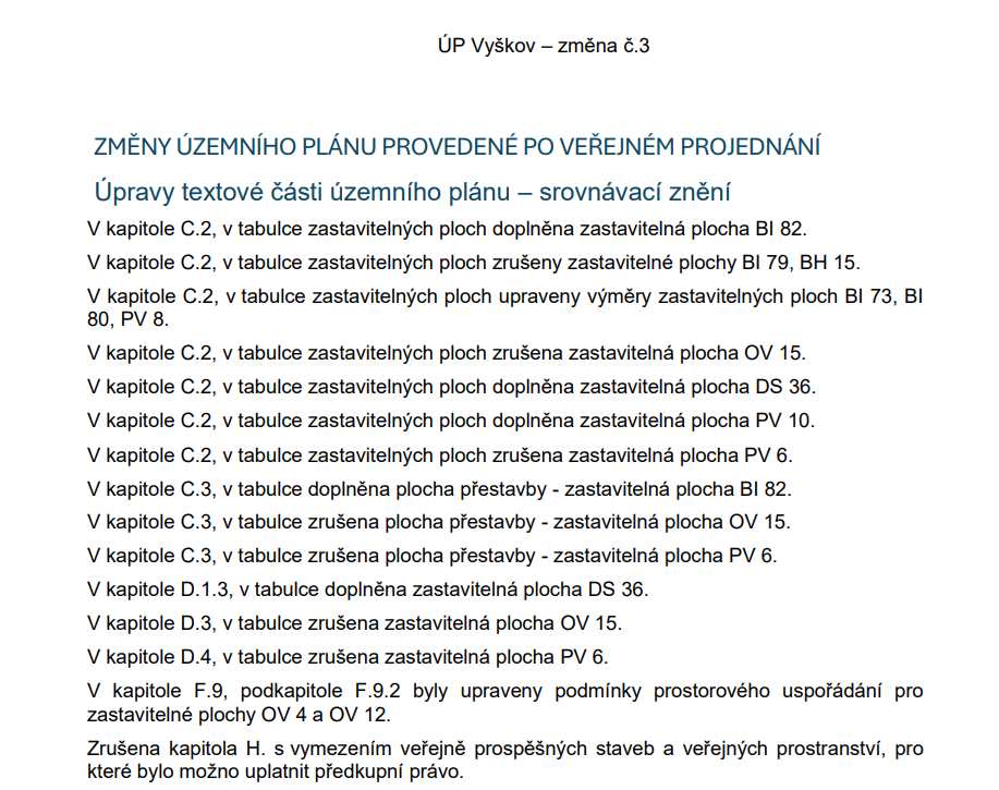 Je také možné zpracovat ještě další doplňující text, který shrne provedené změny jako třeba u Změny č. 3 ÚP Vyškov: